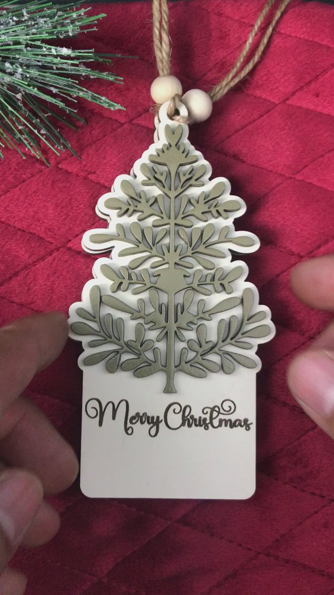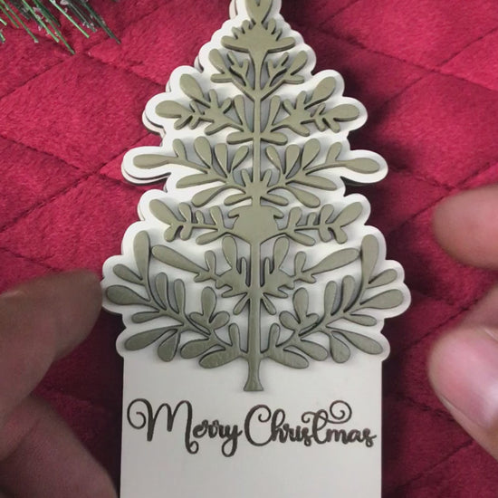 A beautiful layered wooden Christmas ornament, featuring a forest green or dark red cutout of a festive tree over a white base engraved with "Merry Christmas," perfect for adding rustic charm to your holiday decor.