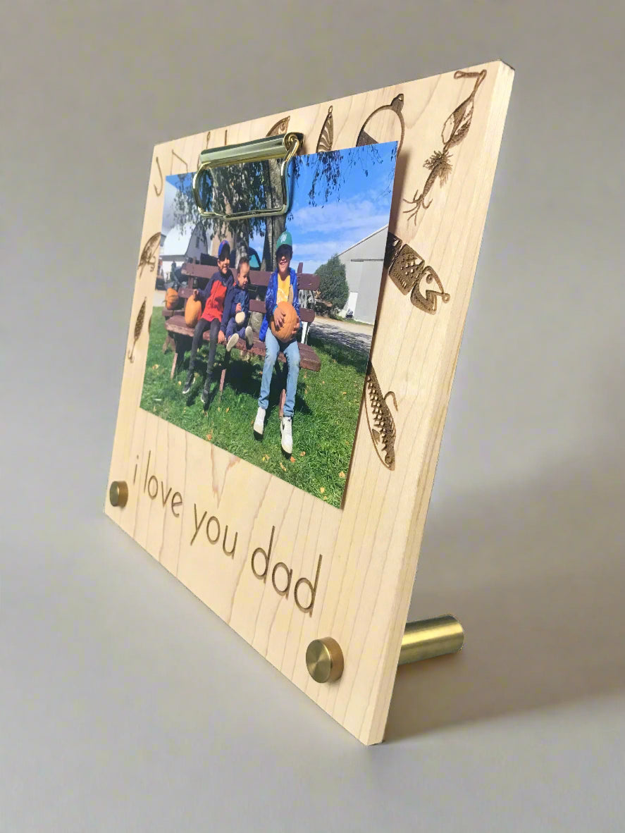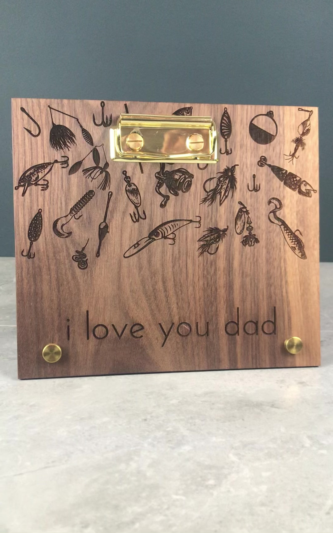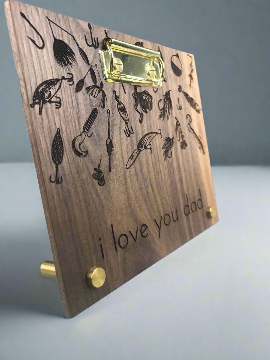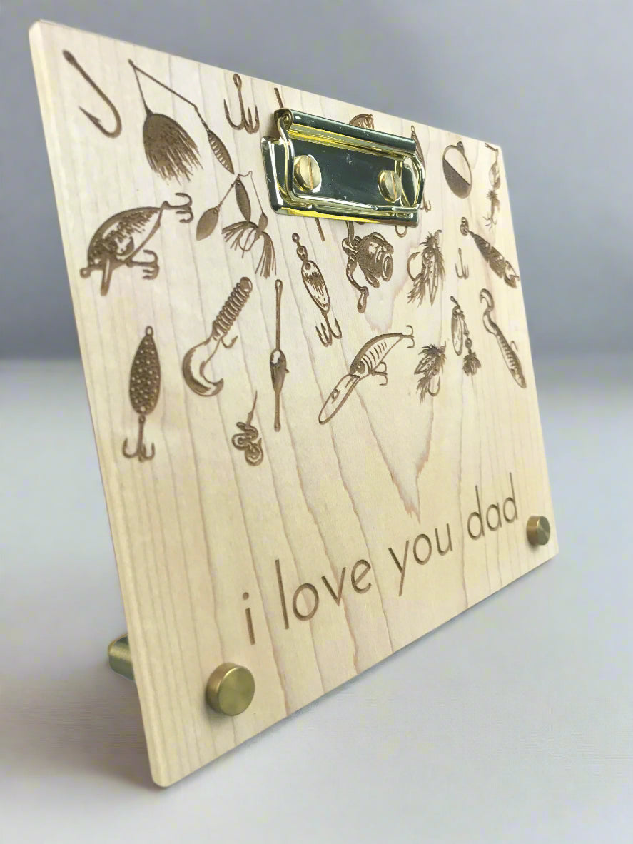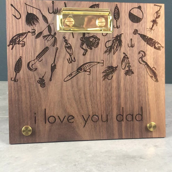 Made from high-quality solid wood, this frame is a timeless piece that combines rustic charm with heartfelt sentiment. The front features intricate laser-engraved details of fishing hooks and lures, perfect for the dad who finds joy on the water. At the heart of the frame, the message "i love you dad" is elegantly engraved, making it a daily reminder of your love and appreciation.