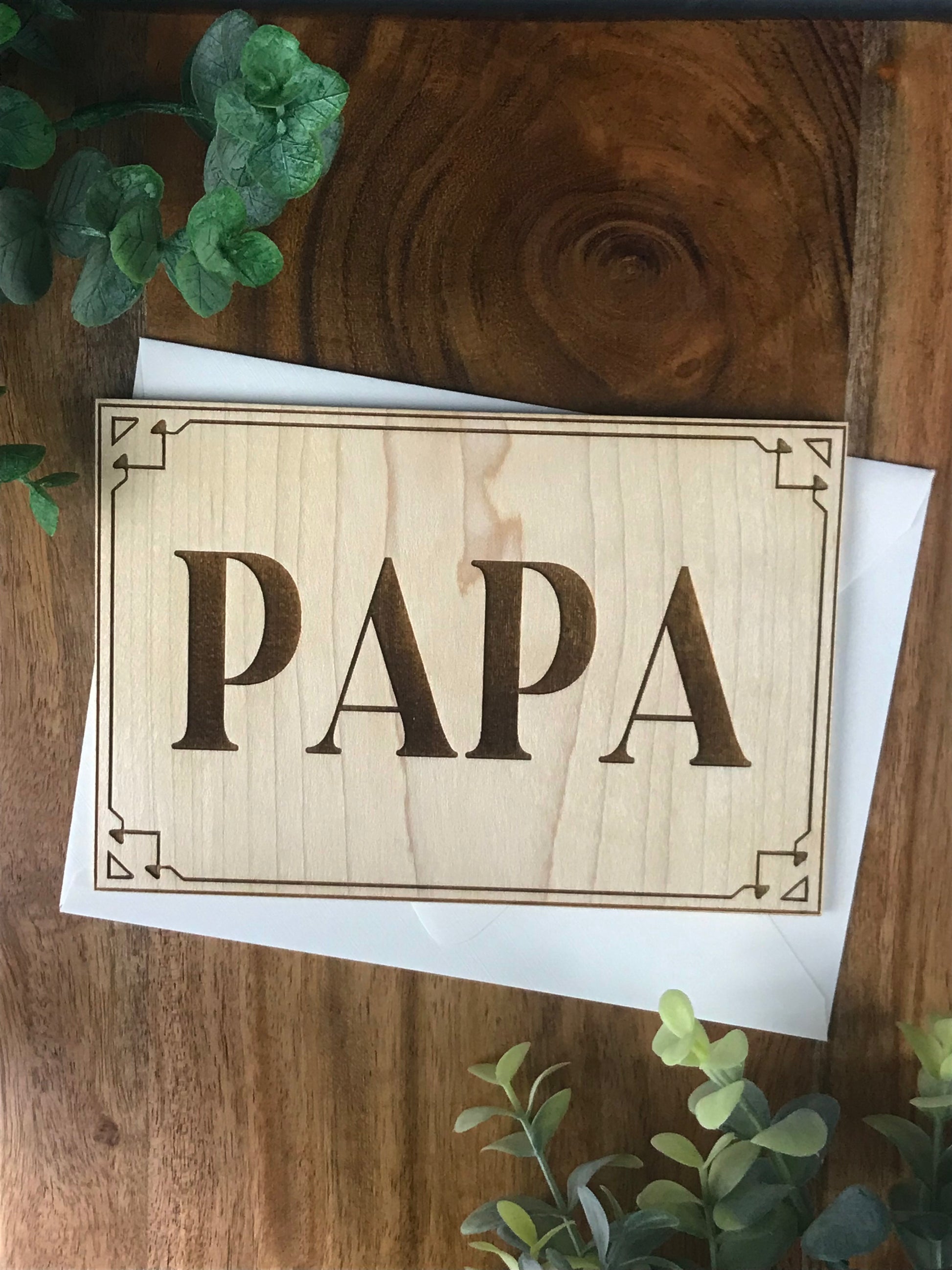 This solid wood Father’s Day card is a unique and lasting way to celebrate Dad. The front features the word "PAPA" boldly laser engraved into the natural wood grain, creating a simple yet striking design. On the back, you can add a personalized message with custom laser engraving to make it even more meaningful. A timeless keepsake that shows your appreciation in a truly memorable way.