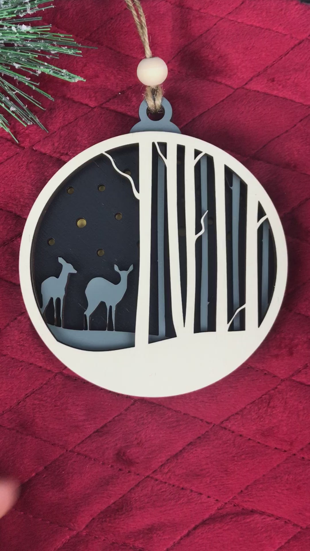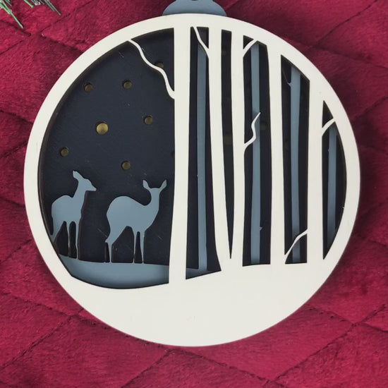 Capture the quiet magic of a winter's night with our Winter Deer Scene Ornament. This beautifully layered ornament features two graceful deer amidst a stylized forest, creating a peaceful, dimensional scene perfect for your tree.